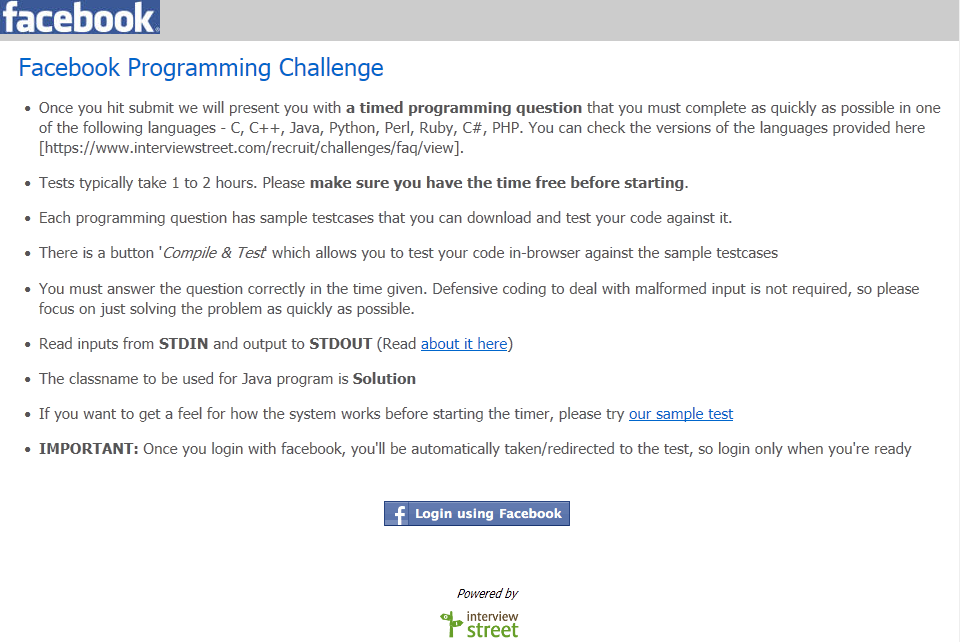 Pero hay un camino para conseguir una entrevista en Facebook: Solamente hay que solucionar una prueba de programación y una vez superada correctamente, Facebook llama a las personas para una entrevista.